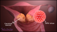 The cervix is cylindrical in shape and lies at the lower end of the uterus, which connects the uterus to the vagina. The cervix is divided into two parts: the lower part is called ectocervix and this lies within the vagina. The upper part is called endocervix. Most cervical cancers occur in the region where endocervix and ectocervix meet. Almost all cervical cancer cases are attributed to the Human Papillomavirus also called as HPV infection.